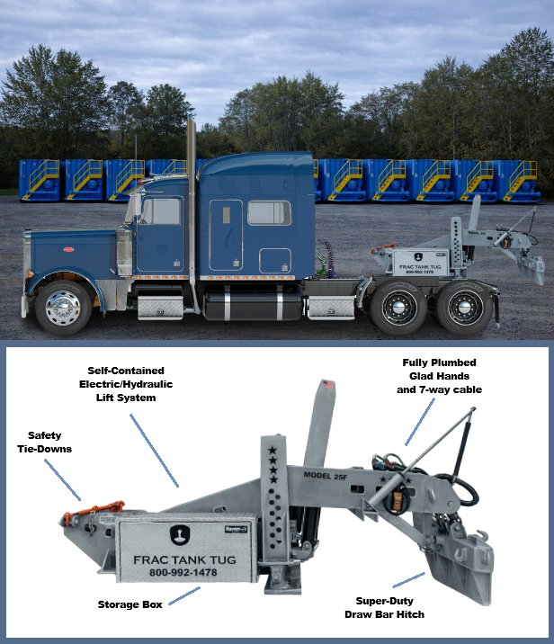The new Model 25F Frac Tank Tug converts any standard fifth wheel tractor for Frac Tank towing service in just minutes. Quickly installs with a forklift or over head hoist. Tow empty Frac Tanks with ease. Includes safety stand and chock blocks to assist in the double snatch lift required to bring the front of the tank up to towing height. As with all of our towing systems, safety is paramount incorporating multiple safety tie downs ensuring a stable and secure frac tank towing experience. The Model 25F Frak Tank Tug features a hot dipped galvanized finish to provide years of protection against harsh road conditions. Plummed Glad Hands and 7-way cable